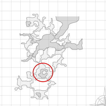 ここです。 赤丸中央がカンパニエの拠点、濃くなっている部分は池で、この周辺にカニがいっぱいいます。